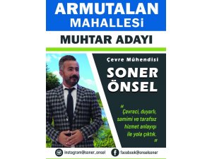 Armurtalan Mahallesi'nde Çevre Mühendisi 35 yaşındaki Soner Önsel, muhtar adayı olduğunu açıkladı. Çevre Mühendisliği Danışmanlık hizmeti veren muhtar adayı Önsel, aynı zamanda turizm sektöründe de faaliyet gösteriyor. Çevreci, duyarlı, samimi ve tarafsız bir hizmet anlayışıyla yola çıktığını kaydeden Soner Önsel, mahalle yaşayanlarıyla, kamu kurum ve kuruluşları arasında çözümleyici bir köprü olmak için Armutalan Mahallesi Muhtarlığına adayı olduğunu vurguladı. Genç ve enerjik bir aday olduğunun altını çizen Önsel, mahallelinin her türlü sıkıntısıyla ilgileneceğini, özverili bir şekilde, gerekli hizmet ve yardımı yaparak hizmet edeceğinin sözünü verdi. Yaklaşan yerel seçimler öncesinde afiş ve broşürler hazırlayarak projelerini mahalle halkıyla paylaşan Önsel, mahalleyi ilgilendiren sorunları toplum olarak hep birlikte çözülmesi gerektiğini savundu.