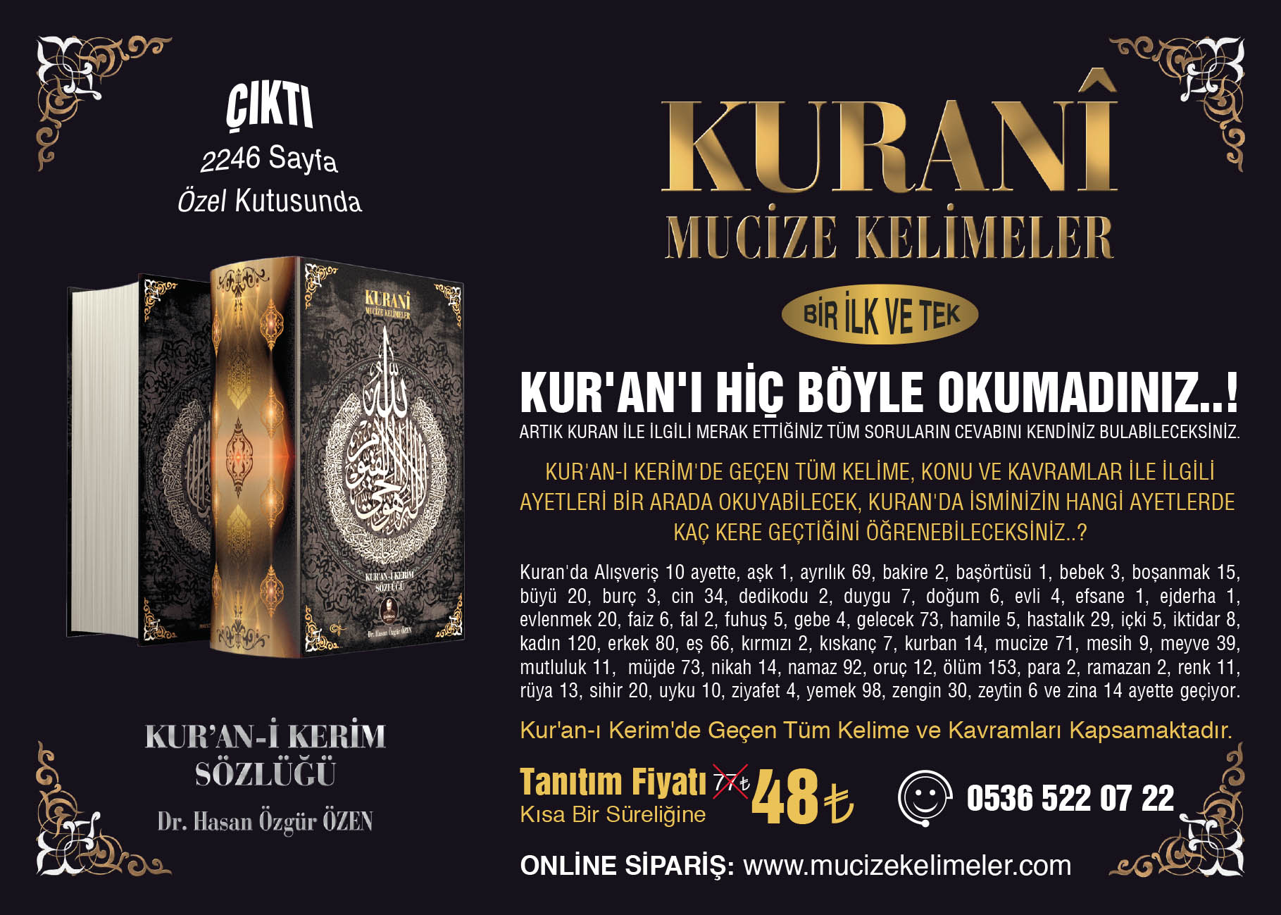 TBMM Strateji Bürosu Sorumlusu Dr. Hasan Özgür ÖZEN’in projesi olarak ve hazırlanıp piyasaya sürülen KURANÎ MUCİZE KELİMELER kitabı ile Kuran ile ilgili merak ettiğiniz tüm soruların cevabını kendiniz bulabiliyorsunuz. Kur’an-ı Kerim’de geçen tüm kelime, konu ve kavramlar ile ilgili ayetleri bir arada okuyabiliyor, isminizin Kuran’da kaç kere, hangi ayetlerde geçtiğini görebiliyorsunuz.