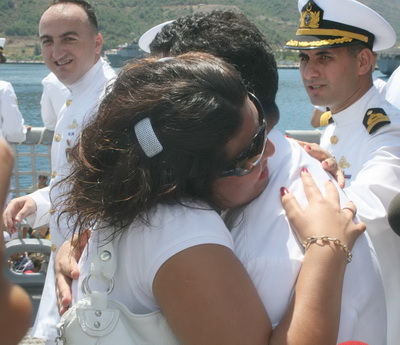Giresun, karaya yanaşırken göründüğünde, fırkateynde görev yapan askerlerin yakınları tarafından uzun süre alkışlandı. SAT ve SAS komandoları tarafından yapılan gösteriler arasında sonra üsse demirleyen fırkateyne alınan asker yakınları, 4 ayı aşkın süredir yollarını gözledikleri, çocuk, eş ve kardeşleriyle kucaklaşıp hasret giderdi. Bu arada Aksaz Deniz Üs Komutanı Tümamiral Yalçın Kavukcuoğlu da fırkateynde TCG Giresun'un Komutanı Deniz Kurmay Albay Cenk Dalkanat'tan bilgi aldı.