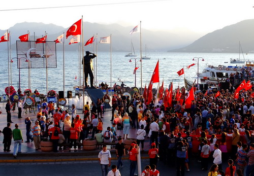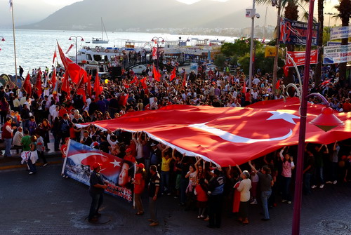 Muğla'nın Marmaris ilçesinde Cumhuriyet Yürüyüşü gerçekleştirildi. Yürüyüşe yaklaşık 2 bin kişi katılırken, coşkulu kalabalık ellerinde Türk bayrakları ve Atatürk posterleriyle renkli görüntüler sergiledi.
