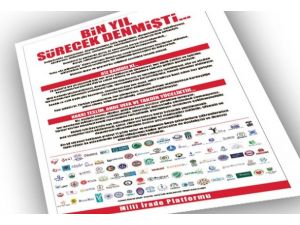 "Milli İrade Platformu" adıyla bir araya gelen, aralarında Hak-İş, Memur-Sen, Türkiye Yazarlar Birliği, MÜSİAD, ASKON, İHH, Muradiye Kültür Vakfı'nın da bulunduğu 97 kuruluş ve dernek, gazetelere tam sayfa ilan verdi. "Bin yıl sürecek denmişti..." başlıklı ilanda, "değerlerin, inançların, düşüncelerin, kılık-kıyafetin, derneklerin, vakıfların, okulların, dükkanların, atölyelerin, fabrikaların sakıncalı ilan edildiği belirtildi.