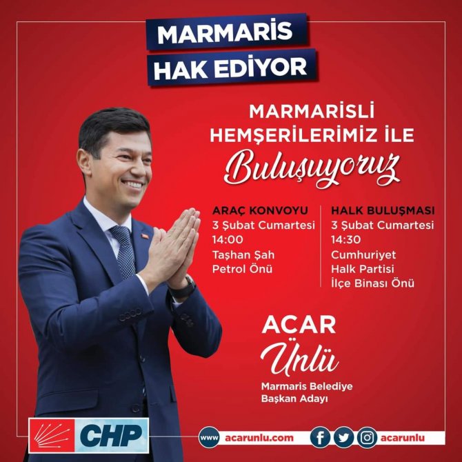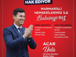 Ardından da saat 14.30’da CHP Marmaris İlçe Başkanlığı önünde Acar Ünlü'nün teşekkür konuşması yapması bekleniyor.