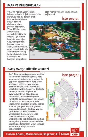 Son yerel seçimlerin üzerinden tam 1 yıl geçti. 29 Mart 2009'da ikinci kez seçilen Marmaris Belediye Başkanı Ali Acar ve ekibi, aralarında 1 yıl içerisinde hayata geçirileceği yönünde söz verilenlerin de yer aldığı seçim vaatlerinin birçoğunu henüz gerçekleştirmedi. Marmaris için bu projeler çok yakında diye duyurulan 'park ve dinlenme alanı' ve 'yaz-kış canlı kalan bir kültür sanat merkezi' projeleri bunlardan sadece bazıları. Genel Yayın Yönetmenimiz Temel Irmak, Ali Acar'ın seçim bildirgesinde yer alan 60 vaadi mercek altına aldı ve yazdı. Ayrıntıları, gazetemizin 29 Mart Pazartesi sayısında bulabilirsiniz.