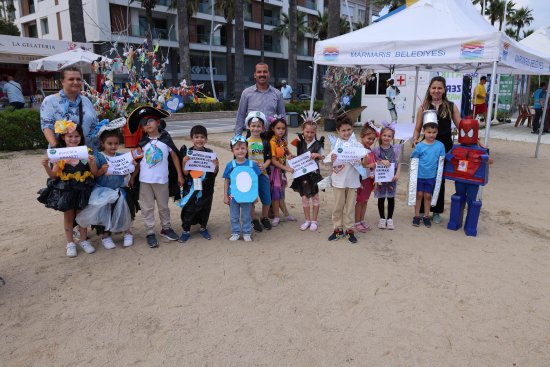 Marmaris Halk Plajı’nda Belediye Başkan Yardımcısı İhsan Öztürk, Kültür ve Sosyal İşler Müdürü Suzan Zift ile Temizlik İşleri Müdürü Tugay Tutugan’ın yanı sıra anasınıfı öğrencileri ve Marmaris Doğa Gönüllüleri’nin katıldığı etkinlikte çocuklar yaptıkları resimlerle doğayı koruyalım mesajı verdi. Büyüklerden çevreyi kirletmemelerini isteyen minikler atık malzemelerle oluşturdukları objeleri de sergiledi.