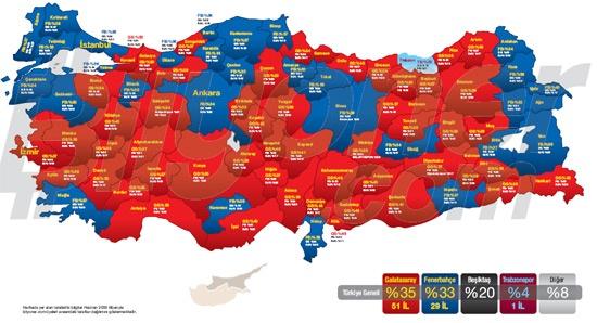 Türkiye'nin 81 ilinde hangi takım taraftarlarının çoğunlukta olduğunu gösteren araştırmaya göre, 5 büyük ilden İstanbul ve Ankara'da en çok taraftarı olan takım Fenerbahçe iken; İzmir, Bursa ve Adana'da ise Galatasaray taraftarı çoğunlukta. Türkiye genelinde ise taraftarların %35'i Galatasaray, %33'ü Fenerbahçe, %20'si de Beşiktaş taraftarı.
