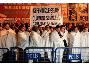 Başbakan Erdoğan'ı Trabzon Havalimanı'nda karşılamaya gelenlerin bulunduğu alana gelen ve üzerlerine kefen giyen Çarşıbaşı AK Gençlik tarafından "Kefenimizle geldik, ölümüne seninleyiz" yazılı pankart açıldı.