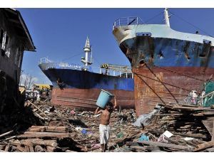 Üzerinden yaklaşık bir hafta geçen tayfunun her geçen gün oluşturduğu büyük yıkım gün yüzüne çıkıyor. Tacloban’nın kıyı şeritlerinde denizden sürüklenip yaklaşık 200 metreye kadar karaya çıkan dev gemiler. afet mağduru halk için barınma alanı olmuş durumda.