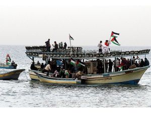 İsrail'in Gazze'de Filistinlilerin denizde en fazla "6 mil açılmasına izin veren" ablukayı kırmak amacıyla, Filistin bayraklarıyla denize açılan onlarca eylemci, İsrail karşıtı slogan atarak, uluslararası toplumdan "Filistinlilerin özgürlüğünü" korumasını talep etti.