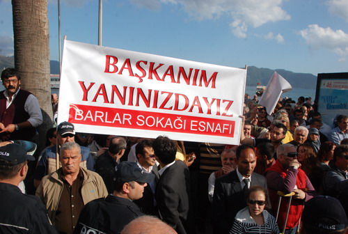 Belediye binası önünde toplanan kalabalık, geçtiğimiz hafta sonunda Barlar Sokağı'ndaki kontrolleri sırasında, ekibiyle birlikte saldırıya uğrayan Belediye Başkanı Ali Acar'a 'Yalnız değilsin' mesajını verdi.
