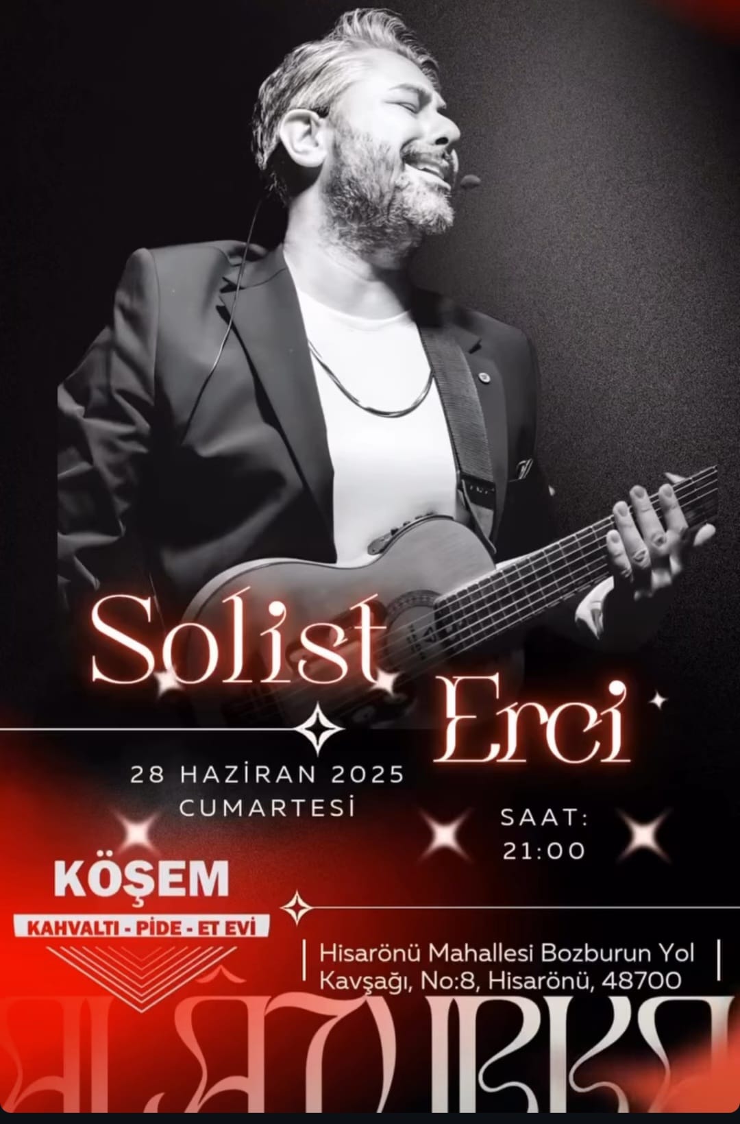 Solist Erci, 28 Haziran 2025 Cumartesi akşamı saat 21.00’de sahne alacak. Güçlü sesi ve repertuarıyla dikkat çeken sanatçı, Köşem Restaurant’ın sıcak atmosferinde sevenleriyle buluşacak.