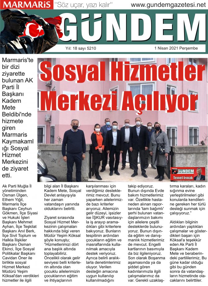 Ak Parti Muğla İl yönetiminden Osman Ülgen, Ethem Yiğit, Marmaris İlçe Başkanı Ceyhun Gökmen, İlçe Siyasi ve Hukuki İşleri Başkanı Mehmet Ayhan, İlçe Teşkilat Başkanı Anıl Berk, İlçe Sivil Toplum ve Halkla İlişkiler Başkanı Osman Ekinci, İlçe Sosyal Politikalar Başkanı Cavidan Öner ile birlikte sosyal Hizmet Merkezi Müdürü Yeşim Köksal’dan verdikleri hizmetler ile ilgili bilgi alan İl Başkanı Kadem Mete, Sosyal Devlet anlayışıyla her zaman vatandaşın yanında olduklarını belirtti.