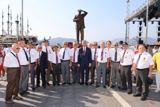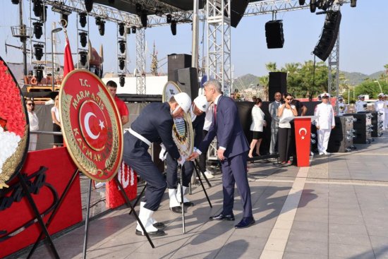 Sabah 09.30’da yapılan Atatürk Anıtı’na çelenk sunum töreninde Kaymakam Ertuğ Şevket Aksoy, Aksaz Deniz Üs Komutanı Tuğamiral Neslim Eski, Marmaris Belediye Başkanı Mehmet Oktay, Başsavcıvekili Cumhuriyet Savcısı Burhanettin Güzel, siyasi parti temsilcileri, gaziler, şehit yakınları ve çok sayıda vatandaş katıldı.
