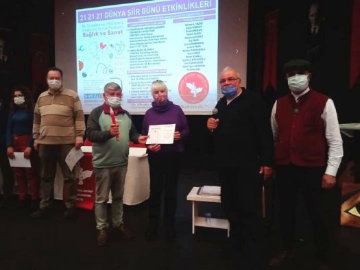 Etkinliğe katılan şairler teşekkür belgelerini Kalimerhaba Derneği Başkanı Selma Sonat ve Uluslararası Aktivist Sanatçılar Birliği Başkanı Ümit Yaşar Işıkhan elinden aldılar.
