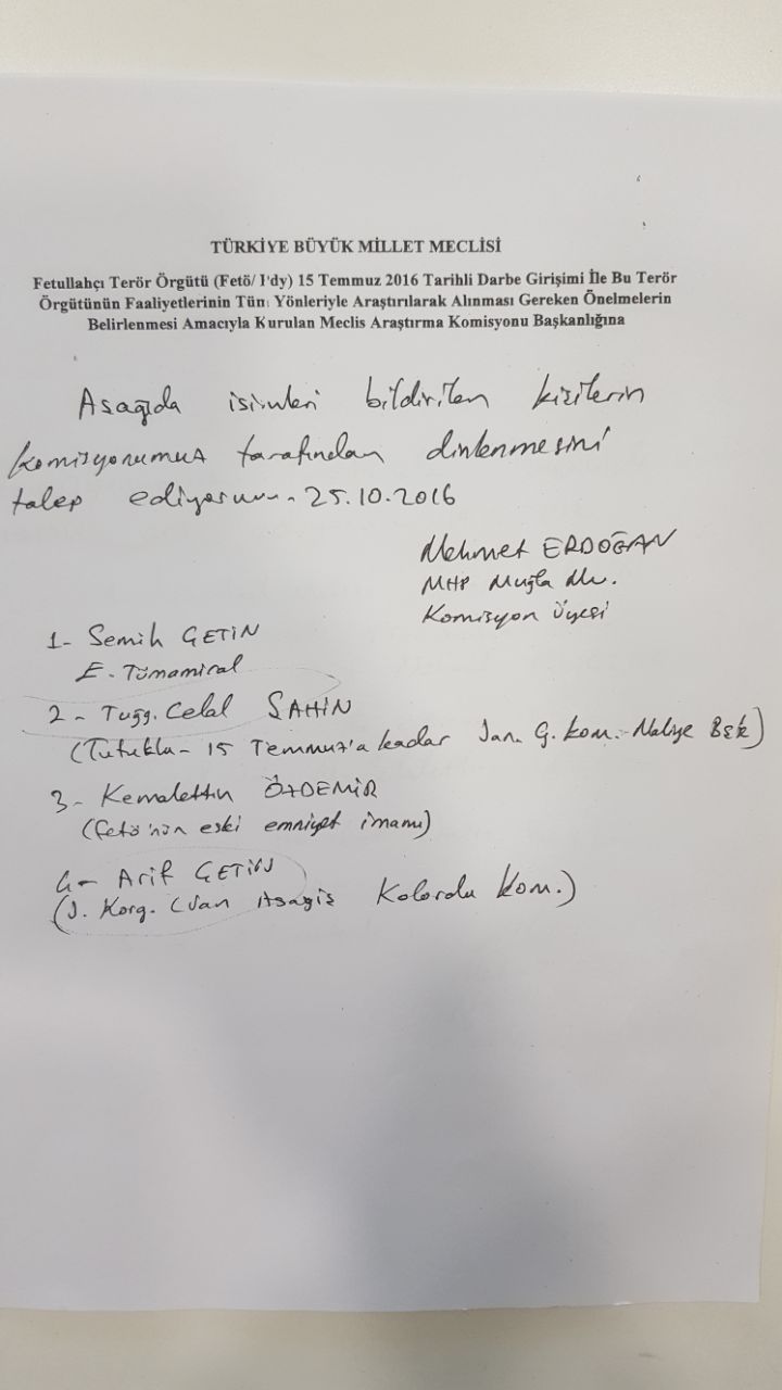· Komisyon çalışmaları esnasında Milliyetçi hareket Partisi’nin Komisyon Üyesi olarak, diplomatik pasaporta sahip ve iltica talebinde bulunan kişilerin listesinin komisyonumuza ulaştırılması talebi yerine getirilmemiştir. Halihazırda böyle bir listenin oluşturulup oluşturulmadığı da merak konusudur.