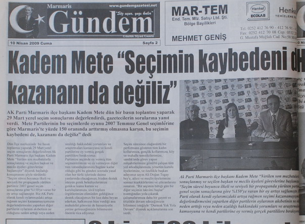 Ak Parti 2007 genel seçimlerinde Marmaris İlçe merkezinde kullanılan 13 bin 776 geçerli oyun yüzde 19.8'ine denk gelen 2 bin 664 oy almıştı. 2009 yerel seçimlerinde ise Ak Parti ülke genelinde 9 puanlık kayıp yaşamasına rağmen Marmaris'te merkezde oylarını katlayarak artırdı, 6 bin 286 seçmenin tercihini kazandı. Marmaris kamuoyunun tamamına yakını bu durumu, Ak Parti'nin Belediye Başkanı Adayı Doğan Tugay'a bağlayıp, Bu oyların çoğu AKP'ye değil Doğan Tugay'a verilmiştir görüşünde birleşti. Kadem Mete ise sık sık Ak Partili olmadığını ima eden Doğan Tugay faktörünü göz ardı etti. Nitelikleri farklı, yerel ve genel seçim sonuçlarını karşılaştırmak gibi bir yolu seçti ve o dönem medya organlarına da yansıyan şu sözleri etti: Partimiz 2007 genel seçimlerine göre oylarını yüzde 150 artırmıştır