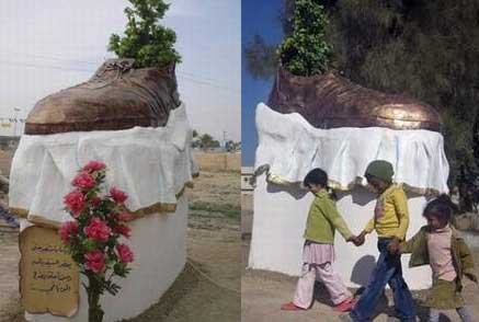 Bush'un kafasını ıskalasa da dünyanın gündemine oturdu. Sahibi cezaevinde ama ayakkabının heykeli dikildi. İşte o heykel;