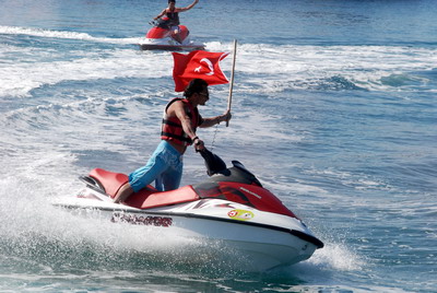 Öte yandan bir spor merkezine ait, ellerinde meşaleler ile Türk bayrakları bulunan sürücüleri taşıyan sürat motorları ve jet ski'ler, Marmaris Körfezinin tören alanının arkasındaki bölümünde yaptığı gösteri beğeniyle izlendi.