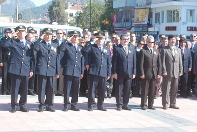 Atatürk Meydanı'ndaki törene ise emniyet görevlilerinin yanısıra Kaymakam Serdar Polat, Belediye Başkanı Ali Acar, Marmaris Cumhuriyet Başsavcısı Vekili Mustafa Küçükoğlu ile kamu kurumları, siyasi partiler ve sivil toplum örgütlerinin temsilcileri de katıldı. Tören Ulu Önde Atatürk ile şehitlerimiz anısına yapılan saygı duruşu ve ardından İstiklal Marşımızın okunmasıyla başladı.