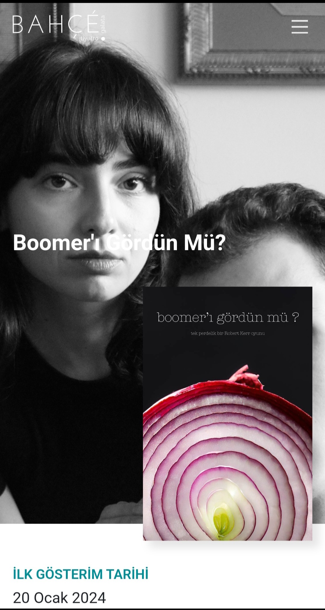 ‘Off-broadway’ bir uyarlama olarak ‘Bahçe Galata’ yı bir adım öne taşı- yan ve prömiyerini ‘20 Ocak 2024 Cumartesi’ günü yapmış olan “Boo- mer’ı Gördün Mü?”, alternatif bir seyrin sonuna kadar hakkını veriyor ve böylelikle nitelikli bir proje daha ‘Bahçe Galata’ güvencesiyle piyasaya sürülüyor. https://bahcegalata.com/oyun/boomeri-gordun-mu
