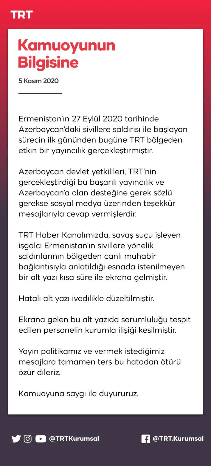 TRT Genel Müdürü İbrahim Eren, TRT Haber’de muhabirin Azerbaycan’daki gelişmeleri aktardığı sırada KJ’de “Azerbaycan sivillere saldırıyor” ifadesine ilişkin, ilgili editörün işine son verildiğini açıkladı. Bundan sonra buna benzer vahim hatalar yaşanmazsa “İlgili o editör gitti, işler düzeldi” diyeceğiz…