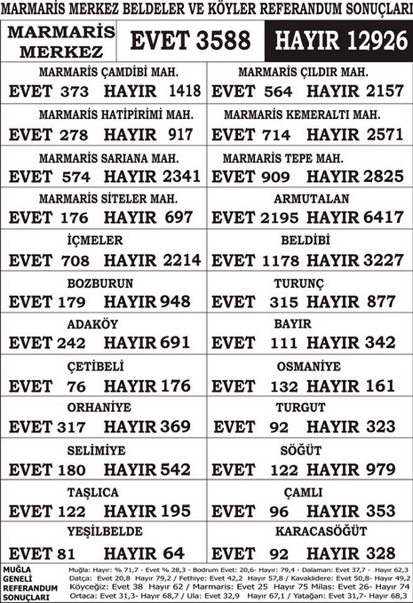 Türk siyasi hayatındaki 6'ncı halk oylamasında 26 maddelik anayasa değişikliği paketi için 12 Eylül'de yapılan referandumda, Marmaris'in ilçe merkezi, tüm belde ve köylerinde tercih aynı çıktı: Hayır