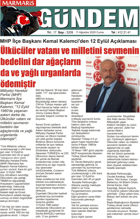 “Türk Milletinin yıllarca unutamayacağı o zifiri kara gün olan 12 Eylül'ün üzerinden tam 40 yıl geçti “olduğunun altını çizen Milliyetçi Hareket Partisi (MHP) Marmaris İlçe Başkanı Kemal Kalemci, şunları söyledi: Kara bir gün olan 12 Eylül 1980 Dış mihrakların sevindiği, Ülkücülerin çile çektiği, TBMM'nin lağvedildiği, Anayasanın uygulamadan kaldırıldığı, Haksızlığı gideren bir demokrasi Adaleti değil de Emret Komutanım adaleti damga vurmuş ve bütün özgürlükler askıya alınmıştır.