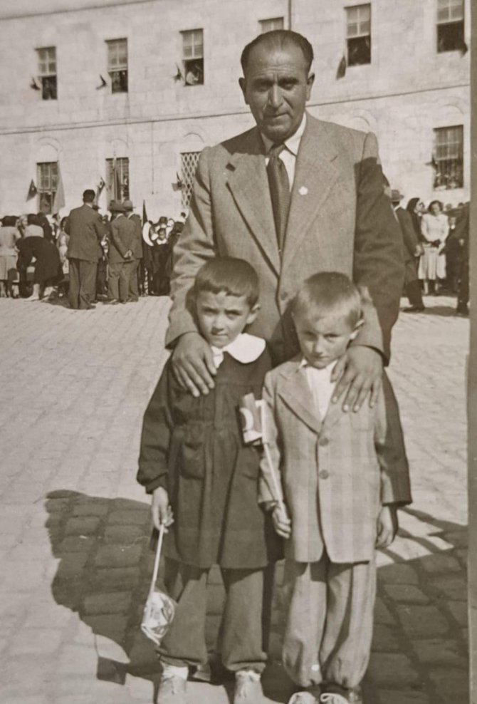 Şimdi bu resme iyi bakın. Yıl 1952. Altı yaşındayım. Sivas Hükümet konağının önünde cumhuriyet bayramı, cumhuriyeti kutluyoruz. Yanımdaki sarışın çocuk dayımın oğlu Feridun. Babam Gezici Başögretmen Ahmet karabenli'nin elleri üzerimizde.