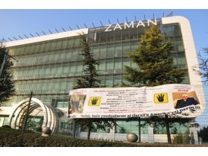 Bir grup vatandaş, Zaman gazetesinin duvarına astıkları pankartla Fethullah Gülen'e "Müslümanlar ezilirken neden sessiz kaldın?" diye sordu.